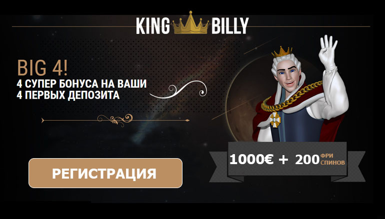 На что Вы обращаете внимание при выборе игорного заведения? Если для Вас важным фактором является наличие разнообразных игр, увлекательных турниров и щедрых промо акций, тогда советуем не упустить выгодное предложение казино Кинг Билли (King Billy Casino)! Если Вы еще не зарегистрировались на их сайте, то самое время исправить это упущение. Ведь казино Кинг Билли предлагает поистине королевский приветственный бонус всем новым игрокам! Не упустите шанс получить 1000 евро и 200 фриспинов от казино Кинг Билли!