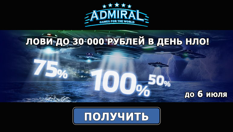 Вносите депозиты один за другим и получайте 30 тысяч рублей! И пусть до сегодняшнего дня явление НЛО до конца не объяснили, это не помешает Вам выиграть потрясающие призы от казино Адмирал 777 в промо акции, посвященной объектам с внеземным происхождением. Ну а если Вам интересны и другие бонусные предложения разных игорных заведений, следите за обновлениями в нашем каталоге онлайн казино.