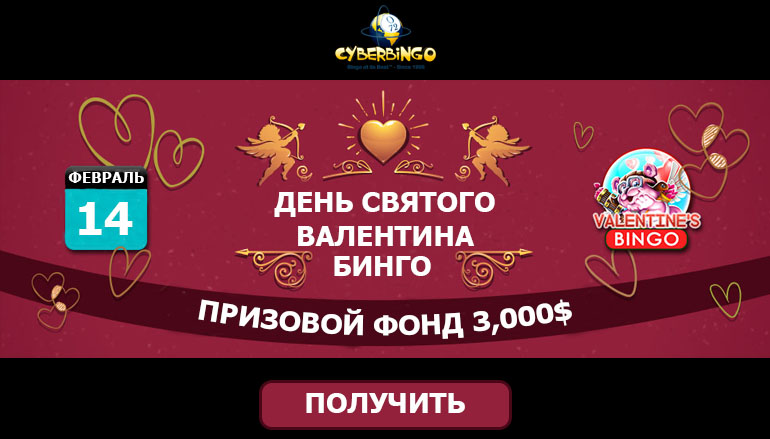 Самый романтический праздник в году, День Святого Валентина, является отличным поводом подарить любимому человеку приятные мелочи и незабываемые мгновения! А можно также отметить этот праздник с размахом. В этом Вам поможет Кибер Бинго (Cyber Bingo). В День Святого Валентина здесь проходит розыгрыш огромных денежных призов! Выиграв один из них, Вы сможете устроить роскошный праздник для своей половинки! Пусть стрела Купидона поразит Ваше сердце, и удача будет на Вашей стороне!