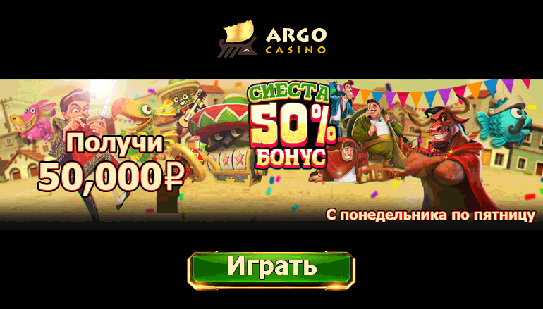Как правильно провести дневную сиесту? Обычно сиеста в Испании это перерыв для отдыха, который включает в себя время на обед и на сон. Однако казино Арго (Argo Casino) предлагает Вам провести свой обеденный перерыв с пользой. Отныне по будням Вам не придется скучать. С понедельника по пятницу у Вас есть потрясающая возможность получить 50% Сиеста бонус от казино Арго!