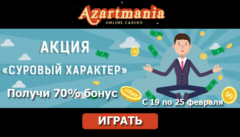 В казино Азартмания (Azartmania Casino) проходит новая увлекательная акция под названием «Суровый характер». Если Вы активны и темпераментны, то Вам не составит труда завоевать до 70% дополнительного бонуса в рамках данного предложения. Настало время проявить свой характер и волю к победе! Присоединяйтесь к участникам акции «Суровый характер» от казино Азартмания прямо сейчас! Вносите депозит и получайте гарантированный бонус в подарок!