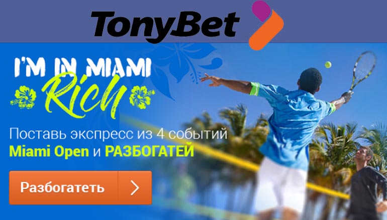 Условия промо акции онлайн ставок на спорт Тонибет устроят каждого! Вам предстоит лишь сделать комбинированную ставку из четырех событий в размере от 10 евро, и Вы получите бесплатную ставку номиналов в 10 евро, если Ваш экспресс не сыграет из-за одного неверно угаданного исхода. Таким образом Вы еще можете разбогатеть в Майами!