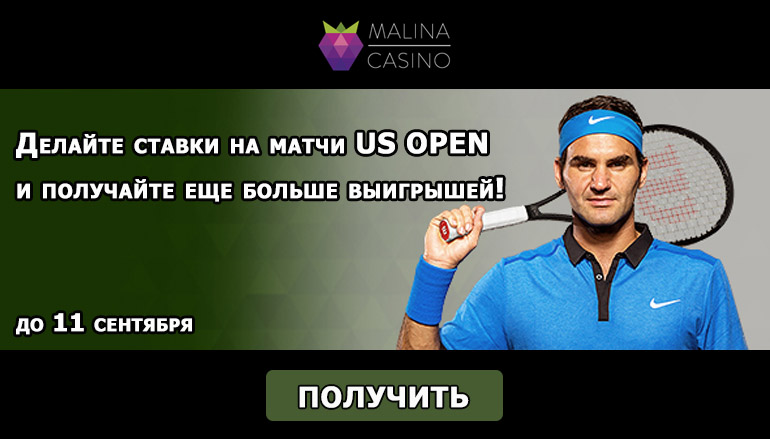 Ты уже знаешь, кто будет следующим чемпионом US Open? Не теряй времени и регистрируйся в казино Малина, переходи в раздел Спорт и делай свои ставки! Чтобы принять участие в промо акции, пополни счет и сделай ставку на один из матчей теннисного турнира US Open! Обрати внимание, что коэффициент должен быть не менее 1.8!