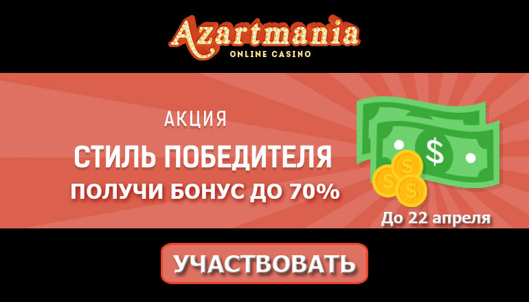 Казино Азартмания ищет игроков, которые умеют побеждать со стилем! Если Вы один из них, то присоединяйтесь к участникам турнира прямо сейчас. Вас ждет неделя безудержной игры и бонусы до 70%! С 16 по 22 апреля принимайте участие в промо акции «Стиль победителя» и получайте вознаграждение от казино Азартмания. Каждого участника, пополнившего счет, ждут дополнительные бонусы за депозит.
