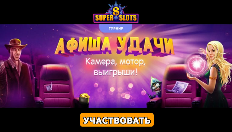 Если Вы любите новые фильмы и спешите в кинотеатр на все премьеры, тогда Вас точно заинтересует данное предложение от казино Супер Слотс (Casino Super Slots). Для всех киноманов игорное заведение проводит новый увлекательный турнир «Афиша удачи». Здесь каждый может почувствовать себя супергероем и выиграть крупный денежный приз. Поспешите, такое кино Вы еще не видели!