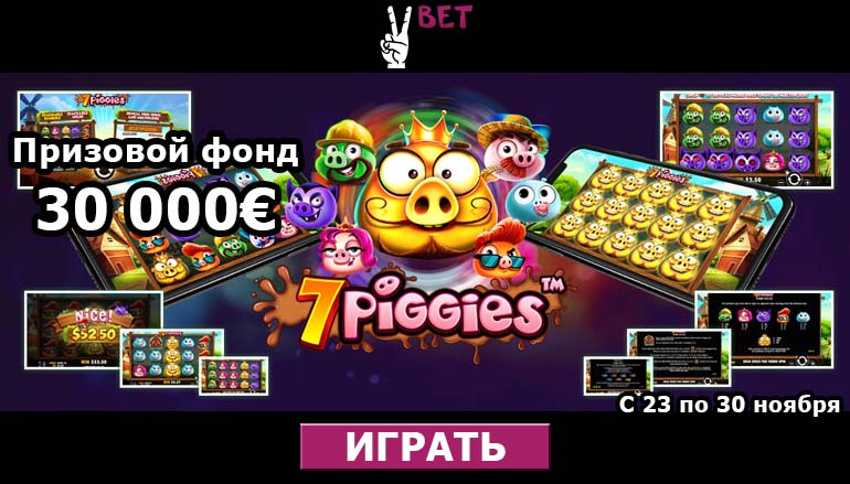 Предложение действует ровно неделю, с 23 по 30 ноября 2017 года, на сайте казино Вбет. За этот период тебе необходимо собрать как можно больше бесплатных спинов на слоте «7 хрюшек», чтобы взять часть призового фонда в размере 30 тысяч евро! За каждый спин, ты получишь по одному очку. Чем больше очков, тем больше твой выигрыш! Начни играть прямо сейчас, и тебя никто уже не сможет догнать!