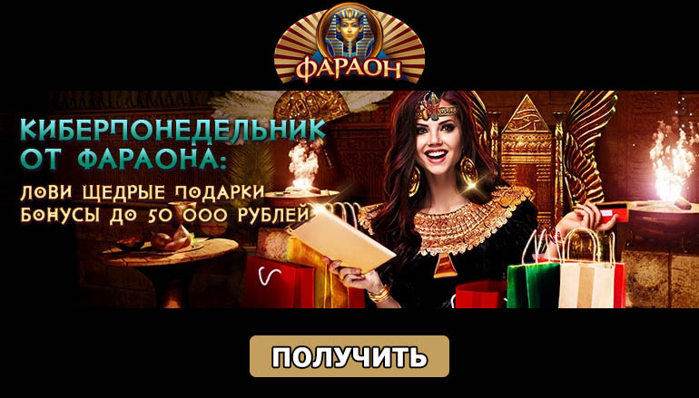 Как известно, после Черной пятницы наступает Киберпонедельник. Этот день по сути является продолжением скидок и распродаж, но уже не в обычных магазинах, а в сети. Для того, чтобы сполна насладиться онлайн шопингом и купить себе все, о чем Вы давно мечтали, примите участие в новой промо акции казино Фараон Бет. Здесь Вас ждет 100% бонус размером до 50 тысяч рублей. Все что Вам нужно сделать – это пополнить баланс на сумму от 10 тысяч рублей одним или несколькими платежами. В понедельник, 26 ноября, в 18:00 по МСК Вы получите 100% бонус от внесенной суммы.