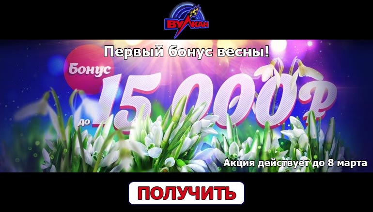 Казино Клуб Вулкан предлагает Вам отметить начало весны с размахом. Принимайте участие в потрясающей промо акции и получайте крупные выигрыши. Предложение действительно со 2 по 8 марта включительно. В этот период Вам нужно пополнить свой игровой счет. При этом размер минимального депозита составляет 500 рублей. Перед тем, как пополнить счет, не забудьте активировать бонус в разделе «Акции».