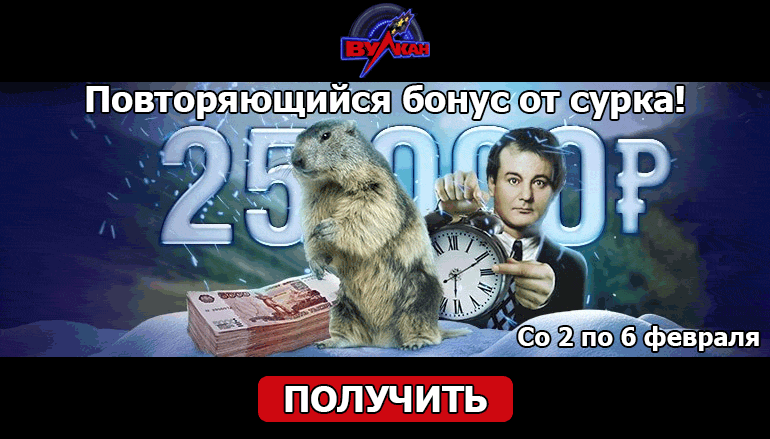 Наверняка многие посетителей сайтов онлайн казино в России слышали про День сурка, который отмечают 2 февраля. Каждый год в этот день люди наблюдают за сурком, вылезающим из своей норы после зимней спячки. По его поведению можно судить о том, как скоро наступит весна. Этому празднику посвящена всеми любимая комедия «День сурка», когда главный герой переживает один и тот же день снова и снова. Каждый день со 2 по 6 февраля в казино Клуб Вулкан (Club Vulkan Casino) то же самое будет происходить и с новым бонусом. Принимайте участие в увлекательной акции и получайте повторяющийся бонус от казино Клуб Вулкан!