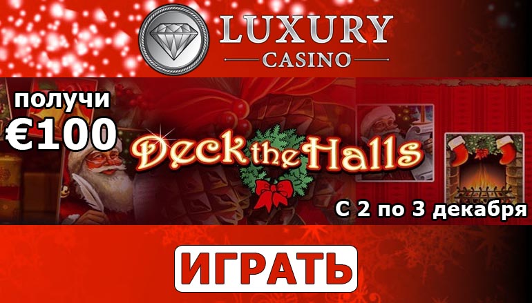 Предложение действует только два дня — 2 и 3 декабря 2017 года! Успей за это время оказаться в числе лучших десяти игроков, которым достанутся 100 евро на слоте «Рождественские украшения» в казино Лакшери! Не упусти такой шанс! А если ты хочешь узнать еще больше об этом онлайн игорном заведении и его бонусах, читай обзор казино Лакшери на нашей странице.