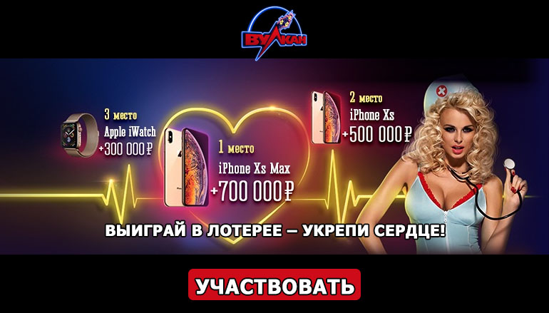 В лотерее ко Дню сердца предусмотрено более 60 призов на общую сумму 2 миллиона рублей! Игроков, занявших первый три места, помимо денежных призов ждут ждут потрясающие подарки от казино Клуб Вулкан! Победитель лотереи получит главный приз — 700 тысяч рублей и Apple iPhone Xs Max (Gold), за второе место предусмотрено 500 тысяч рублей и Apple iPhone Xs (Gold), за третье — 300 тысяч рублей и Apple Watch Series 4. Другие подробности данной лотереи Вы найдете на странице онлайн казино Клуб Вулкан.