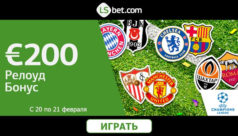 Сделай середину рабочей недели особенно увлекательной и выгодной для кармана. Наблюдай за играми Лиги Чемпионов, чтобы получить €200 Релоуд! Плей-офф 16 клубов Лиги Чемпионов обеспечит тебя щедрой наградой. В то время пока ты будешь наслаждаться матчем, просто запроси 30% релоад бонус 200 евро за ставку на матч Лиги Чемпионов от ЛСбет Спортс. Следующей такой возможности придется ждать, поэтому дерзай прямо сейчас!