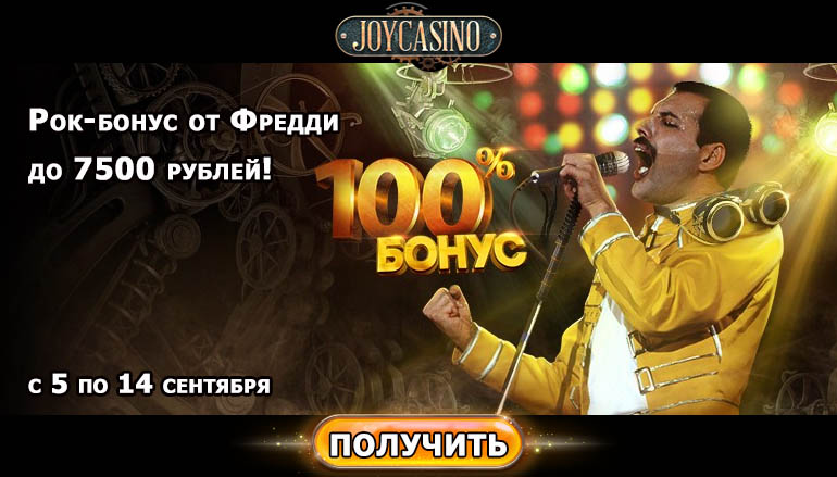 Скорее регистрируйтесь на сайте онлайн игорного заведения Джойказино. Промо акция, посвященная лидеру группы Queen, стартует 5 сентября и завершится 14 сентября в 00:00 по МСК. В этот период Вы можете получить 100% бонус на депозит. Для этого Вам необходимо пополнить счет до завершения промо акции. Перед тем как внести депозит Вам нужно активировать бонус вручную. Минимальный размер депозита, необходимый для участия в акции, составляет 1500 рублей.