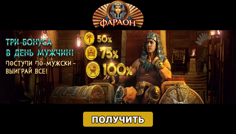 Скорее регистрируйтесь в казино Фараон Бет, где проходит турнир, приуроченный к Международному мужскому празднику. Промо акция стартует 16 ноября и завершится 21 ноября в 00:00 по МСК. В это период Вы можете получить три бонуса в произвольном порядке. За депозит от 2000 рублей Вам полагается бонус «Дерево», который составляет 50% от внесенной суммы до 5 тысяч рублей, а также 20 фриспинов на слоте «Славяне». Если Вы пополните счет на 3000 рублей, то получите в подарок «Дом» – это 75% бонус до 10 тысяч рублей и 15 бесплатных вращений в игре Legends of Ra. Совершив депозит от 5000 рублей Вы получите бонус «Сын» — 50% от суммы пополнения до 15 тысяч рублей и 20 фриспинов в игре Indiana’s Quest.
