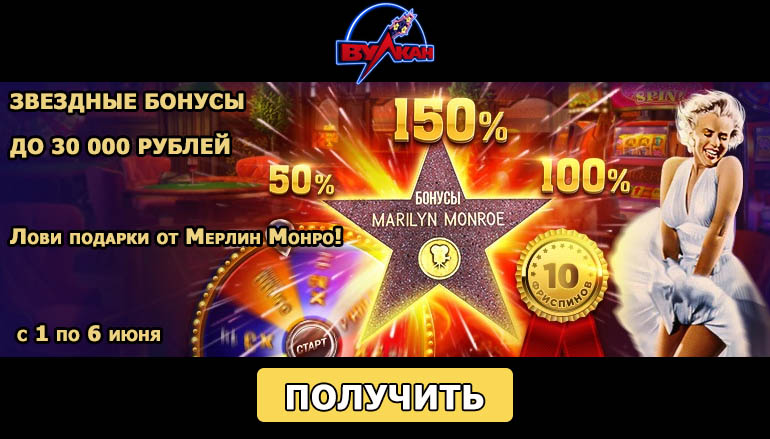 Поочередно вносите депозиты и получайте до 30 тысяч рублей от казино Клуб Вулкан! Поспешите принять участие в потрясающей промо акции и насладиться звездными бонусами от Монро в первый день лета! Ну а если Вы не хотите пропустить и другие бонусные предложения данного игорного заведения, ознакомьтесь с нашим обзором казино Клуб Вулкан.
