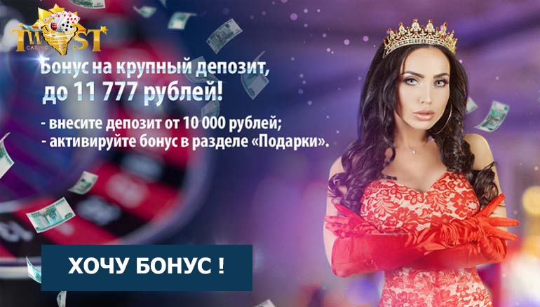 Всех посетителей казино Твист ждут подарки и сюрпризы! Ну а тех, кто любит играть по-крупному, казино вознаградит вдвойне! Все, что Вам необходимо сделать, это пополнить свой игровой счет на 10 тысяч рублей и больше одним платежом. Затем отправляйтесь в раздел «Подарки» и активируйте бонус. Эти два простых шага приведут Вас к желанной награде! Помните, чем больше сумма Вашего депозита, тем крупнее бонус. Если сумма Вашего депозита составит 200 тысяч рублей и больше, то Вы получите максимальный бонус в размере 11 777 рублей!