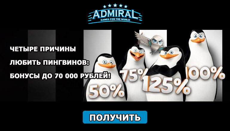 Следуйте простым правилам, поочередно активируя предложения, вносите депозиты и получайте 50%, 75%, 100% и 125% бонусы на общую сумму до 70 тысяч рублей. Помимо денежных наград Вас также ждут и другие подарки: фриспины и бесплатное вращение в игре «Колесо Фортуны». Не упустите возможность получить потрясающие призы из Мадагаскара! Участвуйте в увлекательной акции от казино Адмирал 777 и забирайте подарки от самых крутых пингвинов на планете!
