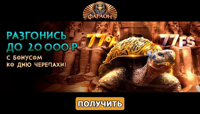 Если Вы еще не зарегистрированы в казино Фараон Бет, то поспешите. Промо акция, приуроченная ко Дню черепахи, стартует 23 мая и завершится 27 мая 23:59 МСК. Для того, чтобы получить быстрый бонус, Вам нужно активировать предложение в разделе «Акции», а затем внести депозит на сумму от 7 тысяч рублей. После чего Вы получите 77% бонус, максимальный размер которого достигает 20 тысяч рублей.