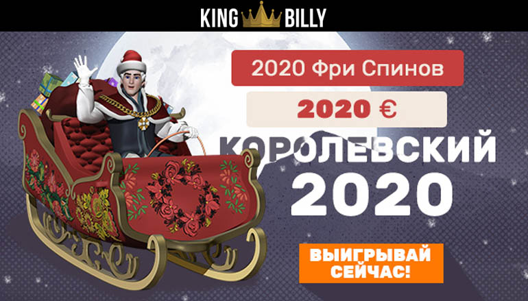 С 11 по 31 декабря заходите на сайт казино Кинг Билли (King Billy Casino), где проходит турнир «Королевский 2020»! Вносите депозит от 1000 рублей и участвуйте в розыгрыше 2020 фриспинов и 2020 евро в течение 20 дней! Скорее присоединяйтесь к акции, чтобы не упустить возможность весело отметить Новый год в Королевстве, а также получить щедрые подарки от самого Короля! Забирайте денежные призы и фриспины в акции «Королевский 2020» от казино Кинг Билли!