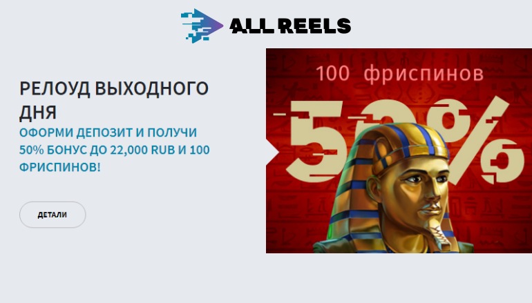 Казино ОлРилс (AllReels Casino) регулярно вознаграждает лояльных игроков за то, что они продолжают играть на их сайте и дарит им релоуд бонус на самых выгодных условиях. Воспользуйтесь предложением и пополните свой игровой баланс в выходные дни. За это Вас ждет щедрое вознаграждение – 50% бонус размером до 300 евро (22 тысячи рублей) и 100 фриспинов. Получите релоуд бонус от казино ОлРилс в уик-энд и наслаждайтесь игрой всю неделю!