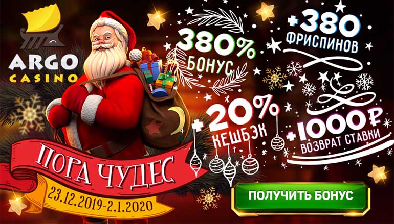 Конец декабря – пора чудес и исполнения желаний. В новогоднюю ночь не только дети, но и взрослые ждут какого-нибудь чуда, получения особенного подарка! Загляните под новогоднюю елку в казино Арго (Argo Casino), там Вас ждет множество призов, включая бонусы до 70%, 380 фриспинов и повышенный кешбэк!
