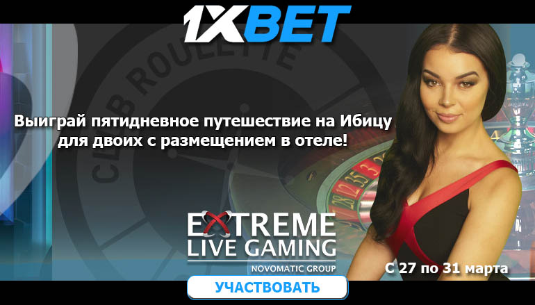 Предложение действительно в период с 27 по 31 марта 2018 года! Успей накопить больше всех очков, чтобы взять главный приз — пятидневное путешествие на Ибицу от казино 1хБет! При этом у тебя будет выбор: отдых вдвоем с размещением в гостинице или 1000 евро! За 2 место ты получишь комплект виртуальной реальности HTC Vive VR Virtual Reality (или €400 в денежном эквиваленте), а за третье — 500 евро! Участвуй в турнире с компьютера или через мобильную версию сайта казино и побеждай!