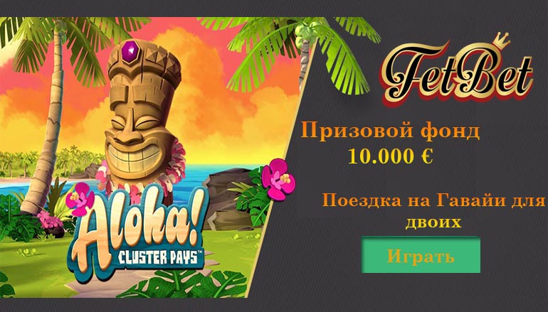 Поспеши и успей получить невероятный приз от сайта онлайн казино Фетбет! Только до 9 июля, приняв участие в розыгрыше, можно стать счастливым обладателем билета на Гавайи. Вместе с этим разыгрываются также целых 10 тысяч долларов наличными! Чем раньше начать, тем больше вероятности взять главный приз. У тебя будут билеты на двоих до Гавайи, семь ночей в четырехзвездночной гостинице в Гонолулу, круиз по каньону на катамаране. Услуги гида также будут включены, занятие серфингом и 250 евро на личные траты!