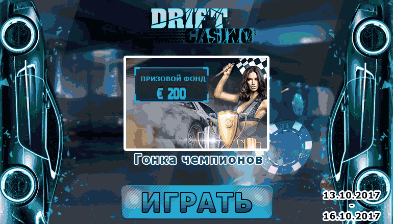 Для всех любителей быстрой езды казино Дрифт (Drift Casino) запускает регулярный турнир под названием «Гонка чемпионов». Если Вы являетесь поклонником «Формулы-1», то это предложение Вас непременно заинтересует. Каждую неделю с пятницы по воскресенье всех любителей адреналина и острых ощущений ждет невероятный драйв! Призовой фонд автогонок составляет 200 евро. Обойдите всех своих соперников и финишируйте первым. Не упустите возможность получить до 200 евро в турнире «Гонка чемпионов» от казино Дрифт!