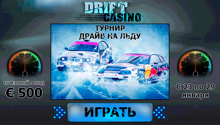 Экстремальное вождение на льду под силу только самым опытным водителям. Именно для таких гонщиков казино Дрифт (Drift Casino) запускает новый турнир «Драйв на льду». Не упустите шанс испытать восторг от заездов по льду и получить подарки от казино Дрифт. Лучшие гонщики разделят между собой призовой фонд турнира «Драйв на льду» от казино Дрифт!