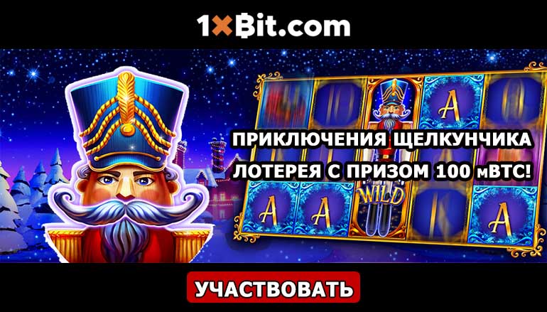 В последний день осени всем поклонникам игровых автоматов 1хБит (1xBit) дарит уникальный шанс совместить любимое занятие с максимальной выгодой для себя. Под конец рабочей недели можно порадовать себя шансом на победу в азартной лотерее «Приключения щелкунчика» от 1хБит. Воспользовавшись заманчивым предложением Вы сможете выиграть реальный капитал из общего лотерейного фонда в размере 100 миллибиткоин (mBTC).