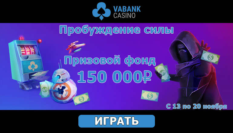 Окажись в числе лучших 20 игроков, ведь именно им достанутся денежные вознаграждения! Самый сильный выиграет 50 тысяч рублей! Однако попав в двадцатку, ты уже получишь возможность принять участие в седьмом заключительном турнире акции «Последние джедаи». Призовой фонд этого турнира составит 350 тысяч рублей! Играй с телефона и получи до 150 тысяч рублей в турнире казино ВаБанк! Более подробно ознакомиться с сайтом ты можешь из нашего обзора казино ВаБанк.