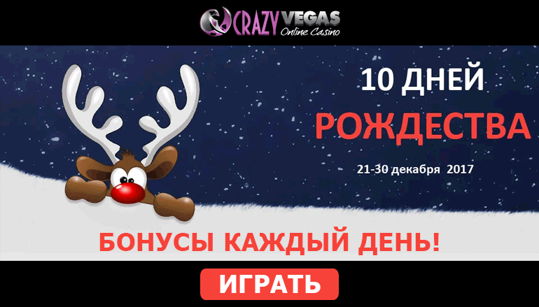 Дед Мороз приносит всем детям, которые хорошо себя вели на протяжении года, подарки их мечты. А гемблерам, которые играют в любимые онлайн азартные развлечения, готов одарить массой презентов сайт онлайн казино Крейзи Вегас! Более того, получать ты их будешь каждый день в течение десяти дней! Бесплатные спины для лучших онлайн слотов, безлимитный бонус 30%, денежные вознаграждения до 200 евро, бонус 25% до 500 евро на последующие 3 депозита и многое другое может стать твоим!