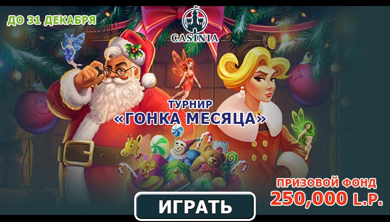 Для того, чтобы начать новый год с чистого листа, нужно проводить старый, завершив все начатое накануне. Возьми от 2017-го все по максимуму, ведь вернуться назад уже не будет возможности! Только в этом, последнем, месяце года петуха тебя ждет щедрый призовой фонд в турнире «Гонка месяца» в казино Казиния! Стань частью огромного выигрыша размером в 250 тысяч L.P. (пунктов лояльности)! А помогут тебе в этом лучшие слоты сайта онлайн казино Казиния (Casinia).