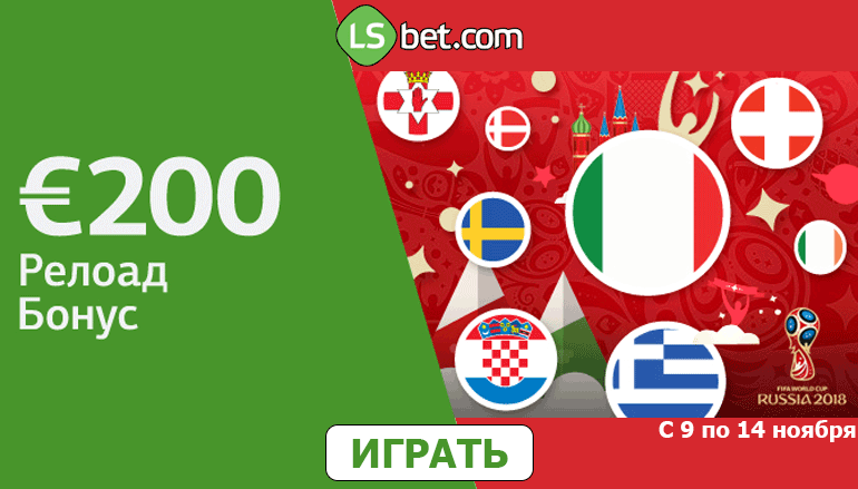 Отборочные игры чемпионата мира по футболу 2018 обещают быть выигрышными с сайтом ЛСбет и его крутым релоад бонусом до 200 евро. Сделай депозит от 20 евро и поставь одиночную ставку в прематче с коэффициентом не меньше 1.50 на любой матч Плей-офф Чемпионата Мира. Предложение действует в период с 9 по 14 ноября 2017 года. Не упусти свой шанс поучить бонус в виде фрибета!