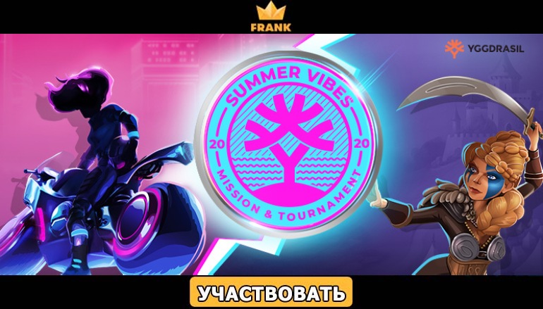 Скорее регистрируйтесь в казино Франк, чтобы успеть принять участие в новой сетевой акции компании Yggdrasil. Кампания Summer Vibes пройдет в два этапа: миссия Neon Lights (с 11 по 15 июня) и турнир Back in Time (с 16 по 21 июня). Для участия в кампании Neon Lights нужно выполнить соответствующие мисси в играх: Neon Rush, Spina Colada, Vikings Go Berzerk. Игроки, выполнившие задания за наименьшее количество раундов, станут победителями и разделят между собой призовой фонд размером в 30 тысяч евро.