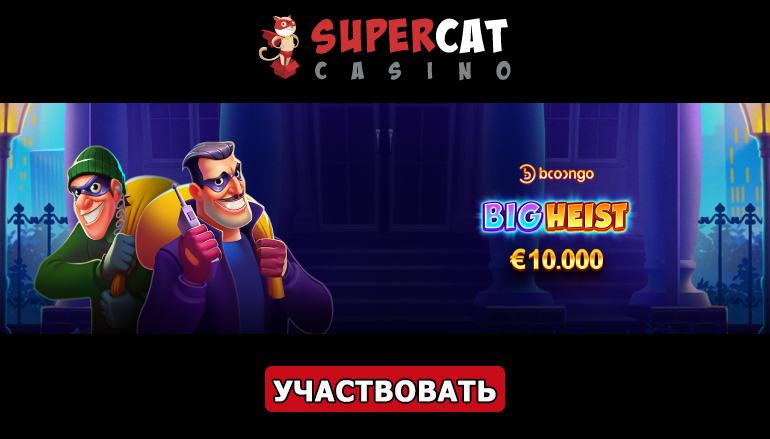 Вы всегда восхищались, когда грабители легко обчищают банки в кино? Что ж, теперь настала ваша очередь попробовать свои силы в новом турнире «Big Heist» в казино СуперКет. Раскрутите барабаны слотов Booongo, станьте лидером соревнования и заберите главную награду – 10% от растущего призового фонда! Ну а для того, чтобы узнать об остальных бонусных предложениях и промо акциях данного игорного заведения, ознакомьтесь с нашим обзором казино СуперКет.