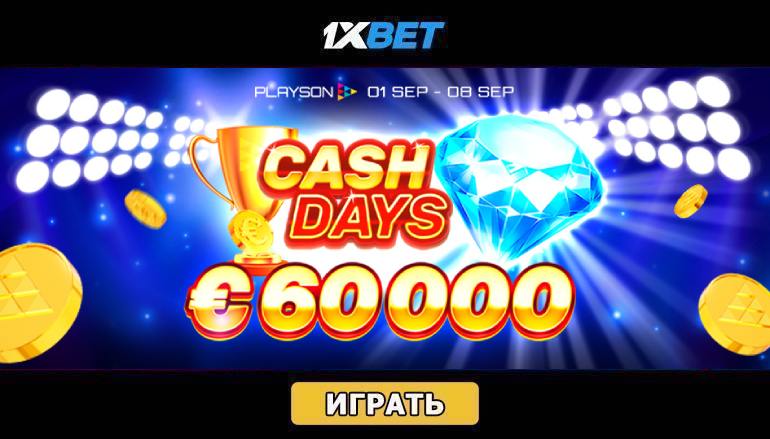 Турнир «Cash Days» в казино 1хБет стартует 1 сентября и завершится 8 сентября в 23:59 GMT. В этот период Вам нужно играть в турнирные слоты компании Playson, совершая ставки на реальные средства. Размер минимальной ставки составляет 0,50 евро.