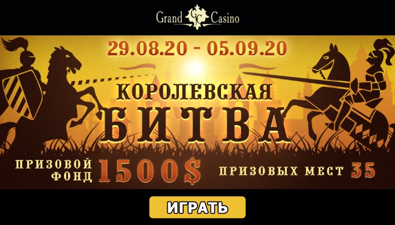 С 29 августа по 5 сентября заходите на сайт казино Гранд (Grand Casino), где Вас ждет настоящая битва. Однако не волнуйтесь, Вам не придется сражаться на мечах или копьях. Вам лишь нужно показать свое мастерство, играя в рулетку. Наслаждайтесь этой увлекательной игрой и занимайте одно из 35 призовых мест турнира «Королевская битва» в казино Гранд!