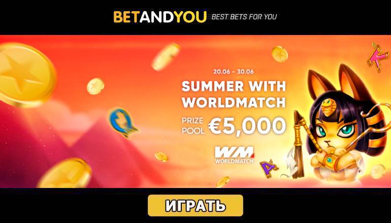 Этим летом компания WorldMatch подготовила для всех любителей видеослотов горячее состязание. Турнир «Лето удачи» в БетЭндЮ – это то, что просто нельзя пропустить в июне этого года. Пришло время вступить в борьбу за один из 30 денежных призов на общую сумму 5 тысяч евро! Так что, не теряя времени присоединяйтесь к новому слот-турниру от провайдера WorldMatch.