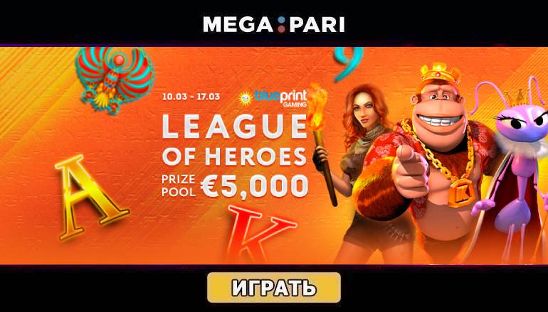 Поклонники игровых автоматов не могут оставить без внимания новый захватывающий слот-турнир. Если Вы тоже являетесь таковым, то в период с 10 по 17 марта заходите на сайт Мегапари (Megapari) и участвуйте в акции «League of Heroes». Это увлекательное мероприятие с 20 денежными наградами на сумму 5000 евро, которые достанутся самым активным участникам. Не упустите возможность отлично провести время, а заодно и побороться за главный приз – 2000 евро!