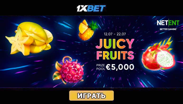 В период с 12 по 22 июля заходите на сайт казино 1хБет (1xBet Casino) и присоединяйтесь к слот-турниру «Сочные фрукты». Вы сможете не только насладиться тематическими слотами компании NetEnt, но и выиграть одну из 15 наград из общего призового фонда в размере 5 тысяч евро. Если вы не прочь освежиться в эти жаркие июльские дни с помощью сочных фруктов на барабанах красочных слотов, или просто ищите свежий взгляд на эстетику фруктовых автоматов, то непременно примите участие в турнире «Juicy Fruits» в казино 1хБет!