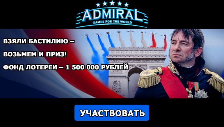 В честь дня взятия Бастилии казино Адмирал 777 (Casino Admiral 777) запускает французскую лотерею! Скорее присоединяйтесь к участникам соревнования и отмечайте главный праздник всех французов вместе с игроками казино Адмирал 777. Вас ждет огромное количество денежных призов! Приобретайте лотерейные билеты и выигрывайте часть внушительного призового фонда – 1 500 000 рублей!