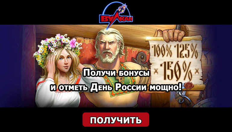Начиная с 12 июня пополняйте баланс на указанную в условиях акции сумму и получайте патриотичные бонусы от казино Клуб Вулкан! Главное не ошибиться и следовать простым правилам предложения! Итак, первое пополнение подарит Вам 100% бонус на депозит, активировав второй бонус, участники акции получат 125% на счет и вдобавок бесплатные вращения в слоте «Славяне». 150% бонус на депозит будет зачислен участникам «добравшимся» до третьего уровня. К нему еще прилагаются фриспины, которые можно реализовать в игре Book of Ra Deluxe.