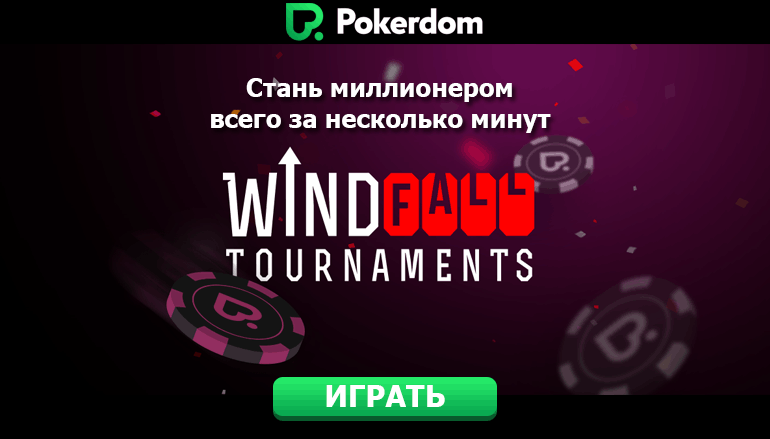 Виндфолл (Windfall) известен и любим покеристами как один самых быстрых способов взять выигрыш. Это быстрые одностоловые турниры, которые длятся всего несколько минут. Само же слово Windfall в переводе с английского означает неожиданную удачу и прибыль. Пусть она обрушится на тебя в виде выигрыша в 1 миллион рублей в одностоловых турнирах Виндфолл в Покер Дом прямо сейчас! В игре такого формата у тебя будет всего два или три соперника, которых ты без сомнения сумеешь обойти!