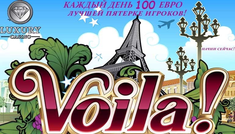 Кто не мечтает оказаться в столь прекрасное и теплое время года в самом романтическом городе, Париже? Не отказывайся от уникального предложения и выиграй 100 евро на слоте Вуаля в казино Лакшери. Почувствуй и вдохни в себя парижскую культуру и атмосферу. Только на этой неделе можно переместиться в сказочный мир Франции и прогуляться вдоль потрясающей Сены. Все это возможно благодаря новой разработке Майкрогейминг (Microgaming) — французскому тематическому видео слоту Вуаля (Voila).