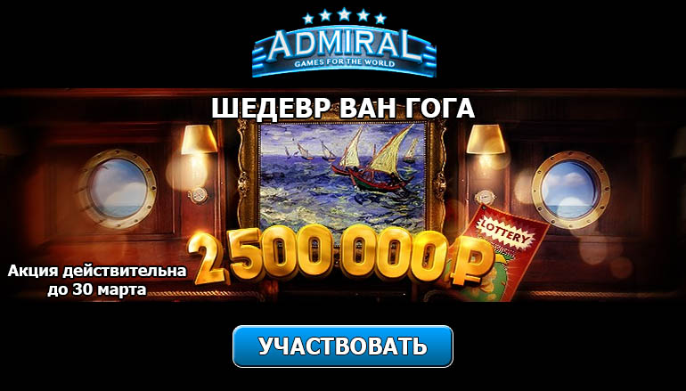 Для тех, кто ценит творчество Ван Гога, казино Адмирал 777 (Casino Admiral 777) запускает новую лотерею с потрясающим призовым фондом 2 500 000 рублей! С 24 по 30 марта принимайте участие в акции, посвященной знаменитому художнику, и выигрывайте один из многочисленных денежных призов. А одному счастливчику достанется главный приз размером один миллион рублей!