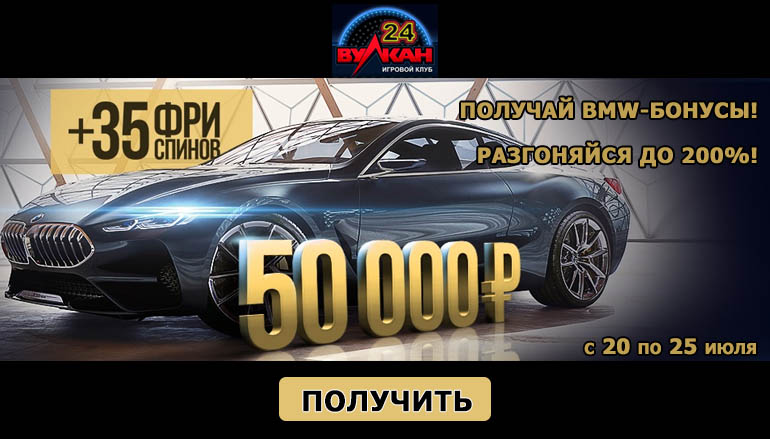 Для истинных ценителей качественных автомобилей и мотоциклов казино Вулкан24 (Vulkan 24 Club Casino) запускает новую промо акцию. Присоединяйтесь к участникам соревнования, приуроченного ко дню рождения торговой марки BMW. Вас ждут целых два бонуса, которые Вы можете получить в произвольном порядке. С 20 по 25 июля пополняйте свой игровой счет и получайте 50 тысяч рублей и 35 фриспинов от казино Вулкан24!