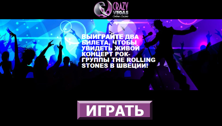 Если Вы являетесь поклонником легендарной рок-группы Роллинг Стоунз (The Rolling Stones), постоянно слушаете их хиты Satisfaction, Gimme Shelter и другие, то эта промо акция Вас бесспорно заинтересует. Казино Крейзи Вегас (Crazy Vegas Casino) делает умопомрачительное предложение всем своим посетителям. Играйте на определенных слотах на сайте онлайн казино Крейзи Вегас и участвуйте в розыгрыше двух билетов на рок концерт. Не упустите возможность получить билеты на шоу Роллинг Стоунз от казино Крейзи Вегас!