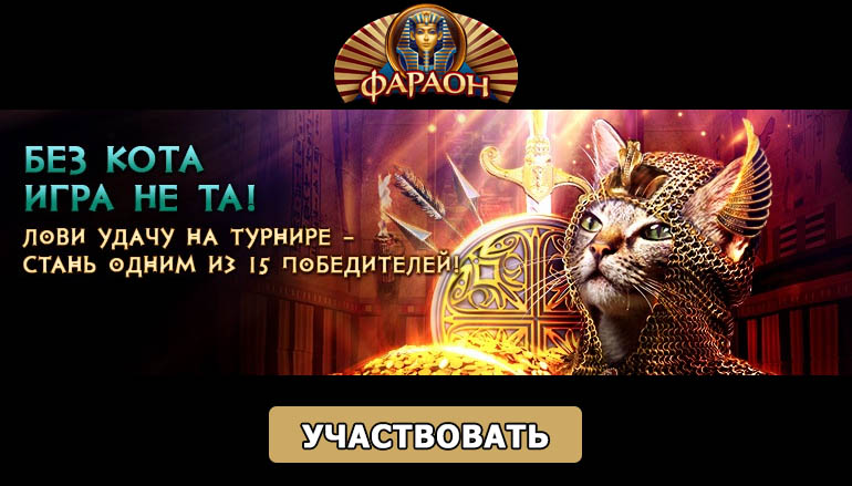 С 6 по 12 августа Вы можете попытать удачу в новом турнире ко Дню кошек от казино Фараон Бет! Призовой фонд соревнования огромный, и он постоянно растет, с каждой ставкой увеличиваясь еще больше. Праздник усатых, хвостатых и полосатых уже начался! Не оставайтесь в стороне, присоединяйтесь к участникам промо акции прямо сейчас. Вам обязательно повезет и именно Вы окажетесь в числе пятнадцати победителей, которым достанутся денежные призы от казино Фараон Бет!