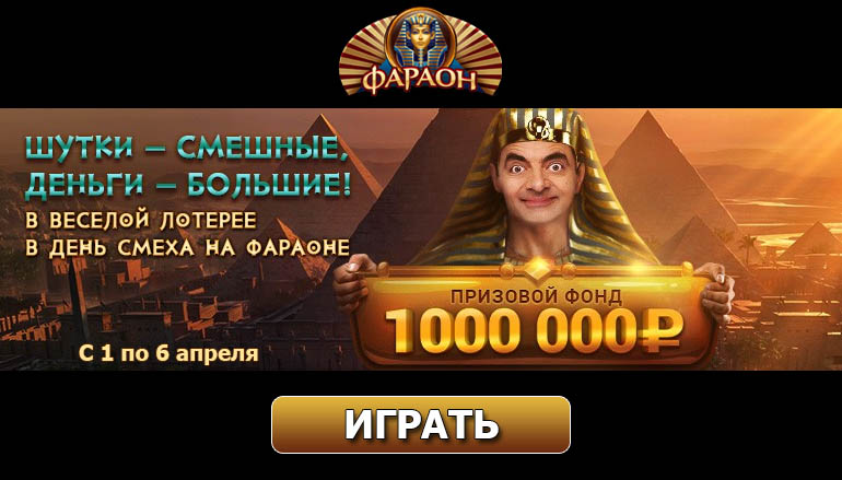В этом году в честь Дня смеха в казино Фараон Бет проходит супер лотерея с призовым фондом в один миллион рублей. Всего в промо акции предусмотрено более 30 денежных призов. Главный приз первоапрельской лотереи — 400 тысяч рублей! Спешите поучаствовать в борьбе за крутые подарки!